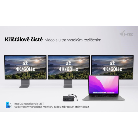 * macOS nepodporuje technologii Multi Stream Transport (MST), takže při připojení dvou monitorů bude na obou zobrazen stejný obraz.