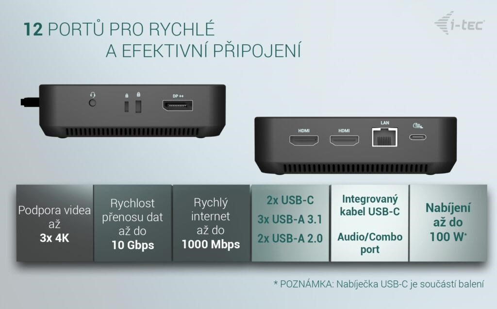 Vysoce výkonná kancelářská dokovací stanice USB-C s podporou až 3 externích monitorů s rozlišením 4K. Stanice je kompatibilní s jakýmkoli notebookem vybaveným portem USB-C, USB4 nebo Thunderbolt 3/4/5. Samozřejmostí je také možnost nabíjení notebooku či tabletu výkonem až 100 W.