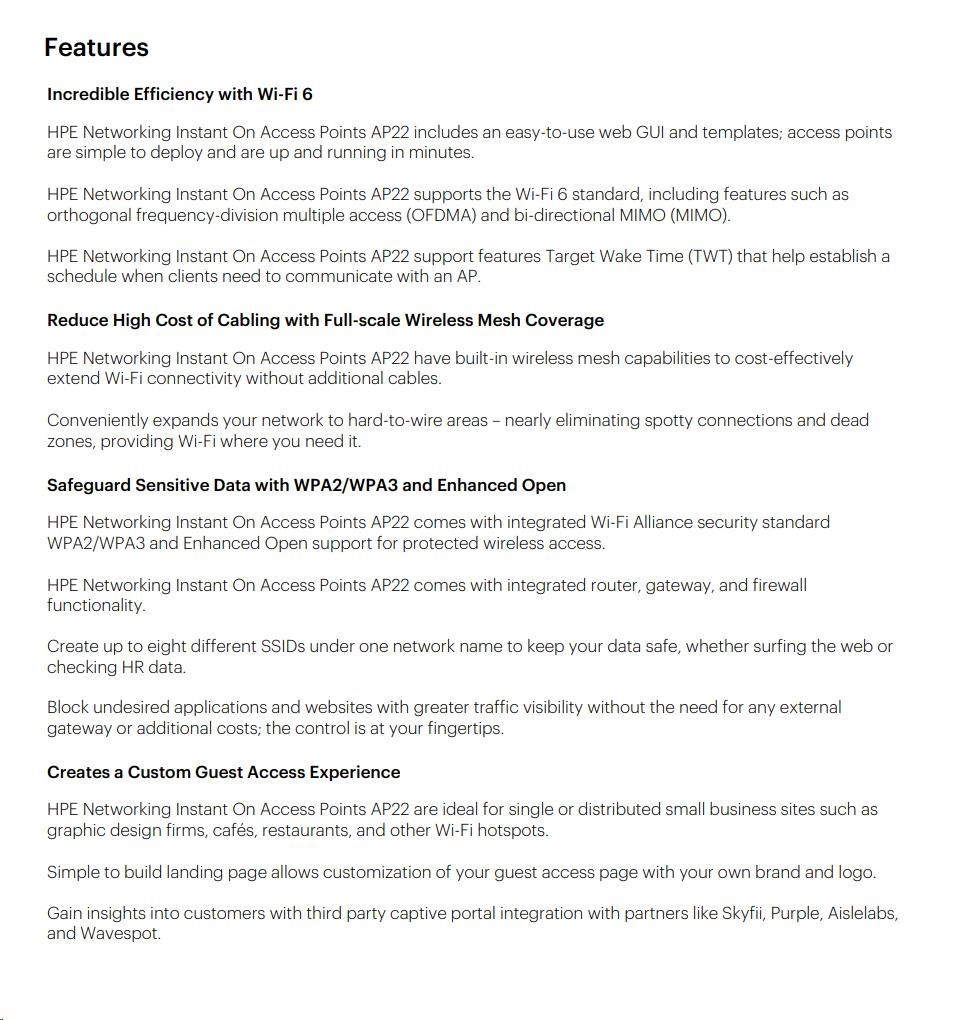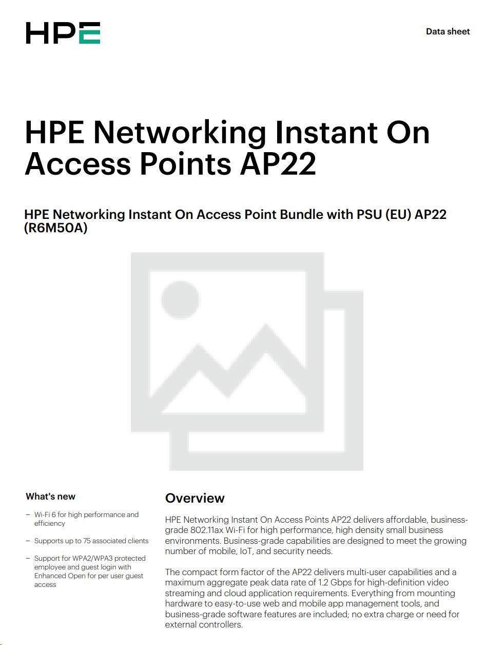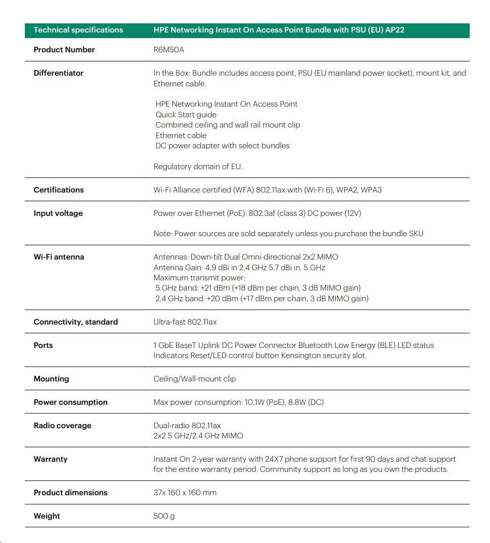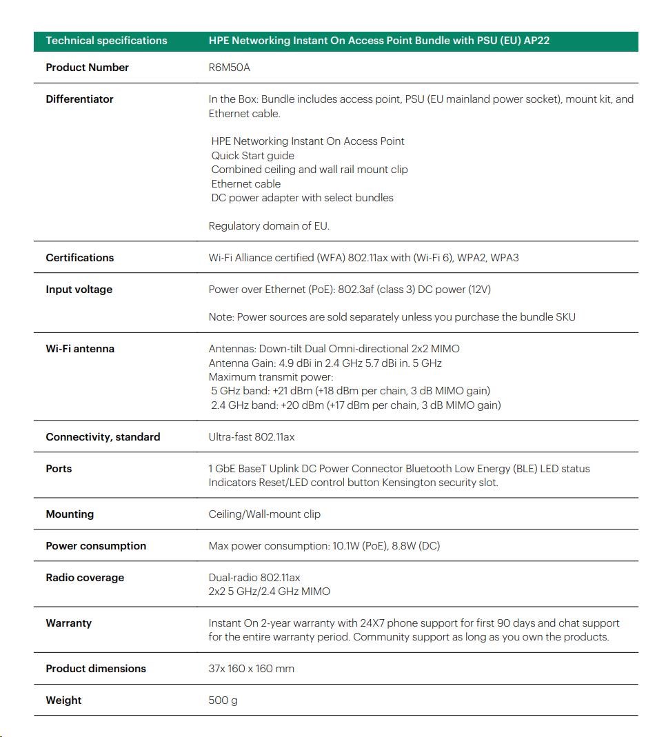 HPE Networking Instant On Access Point Bundle with PSU (EU) AP22 (Includes 12V Power Adapter with EU Power Plug) R6M50A