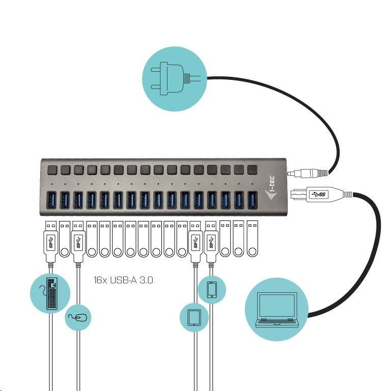 Tento HUB nabízí 16 USB 3.0 portů s funkcí Plug & Play a standardním USB nabíjením – HUB automaticky detekuje, jestli je připojeno zařízení pro USB nabíjení. Díky tomu, že HUB má 16 USB 3.0 portů, je možno nabíjet až 16 zařízení najednou. Rozhraní USB 3.0 je důležité zejména pro datové přenosy z USB 3.0 paměťových karet a flash disků, kde se nejvíce využije jeho vysoká přenosová rychlost. K balení je přiložen externí napájecí adaptér, který vám zaručí stabilní nabíjení z USB portů a výkon HUBu, poskytující nabíjecí výkon až 10 W na jeden port.
