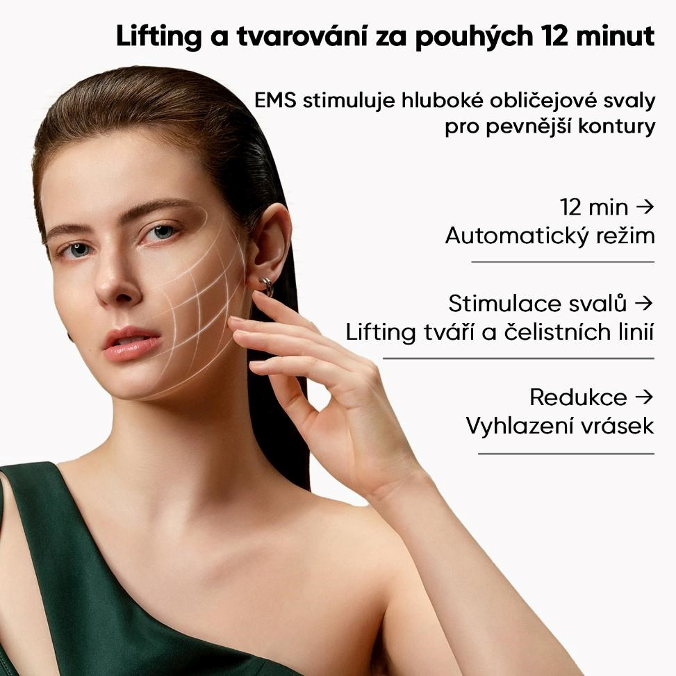 - Pokročilá EMS technologie – lékařská svalová stimulace, která byla dříve dostupná jen v klinikách, je nyní součástí domácí péče o pleť.