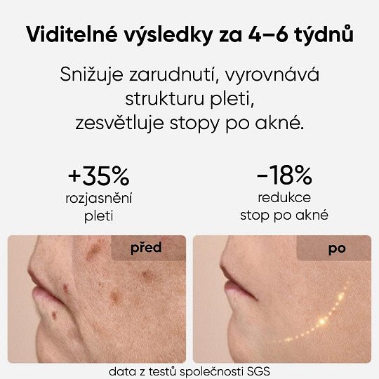 - Viditelné výsledky za 4-6 týdnů: Pravidelné používání prokazatelně redukuje akné, vrásky, pigmentaci a zlepšuje elasticitu pleti.
