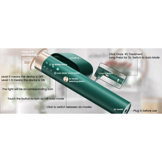 - Přesné cílení na každou partii: 6 specializovaných režimů pro obličej, ruce, nohy, podpaží a oblast bikin s 6 úrovněmi intenzity.