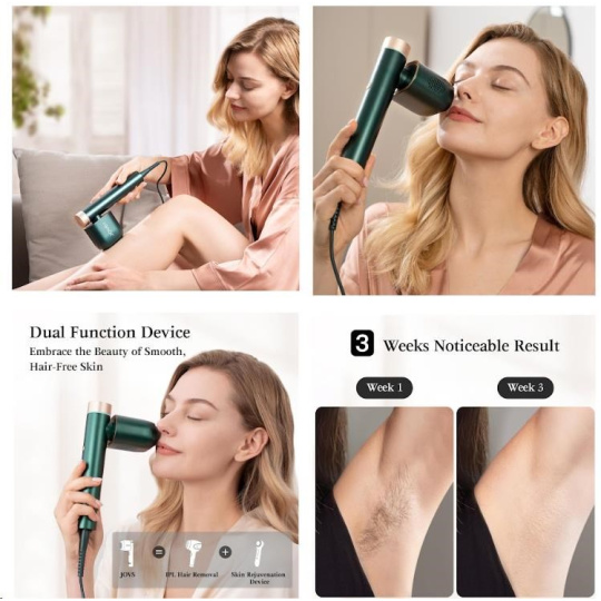 - Hybridní péče 2v1: Kombinuje efektivní odstraňování chloupků (OPT) a omlazení pleti (SR režim) v jednom přístroji.