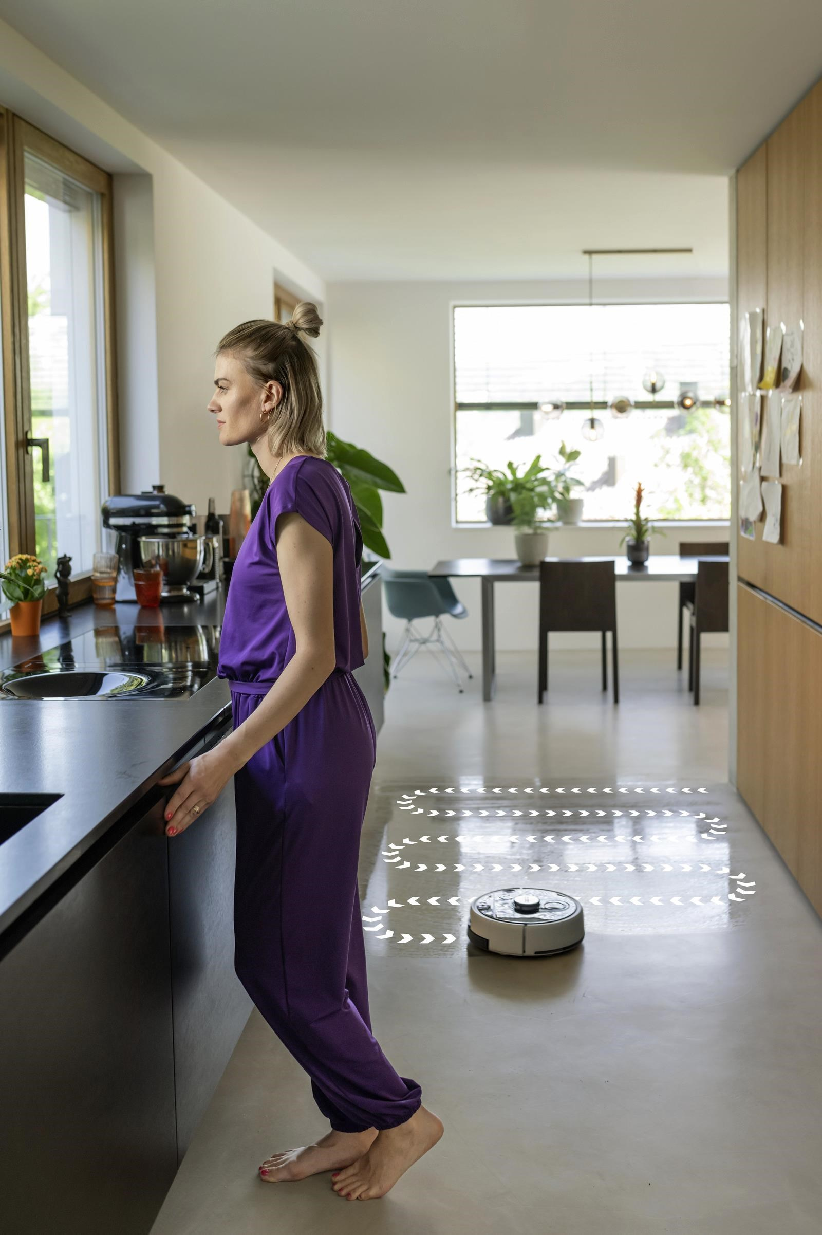Podlahy vyčistíte stisknutím jediného tlačítka: chytrá robotická myčka RCF 3 se od nynějška postará o jinak únavné a časově náročné vytírání tvrdých podlah. Díky osvědčené technologii válce odstraňuje RCF 3 nejen odolnou špínu nebo zaschlé tekutiny, ale také sbírá prach a drobné nečistoty. Přitom automaticky rozpozná koberce a obratně se jim vyhne. RCF 3 má dvě nádrže, které mu umožňují neustále zvlhčovat čisticí válec čistou vodou a zvlášť sbírat nečistoty do nádrže na špinavou vodu. Také lehké, suché nečistoty se snadno zachytí a dopraví do nádrže na špinavou vodu. Pomocí praktického ovládání aplikace lze nastavit různé režimy čištění. Robota tak lze velmi flexibilně přizpůsobit nejrůznějším potřebám a požadavkům. Pro úklid se robot pohodlně spouští prostřednictvím aplikace nebo stisknutím tlačítka na zařízení. Pokud RCF 3 potřebuje pomoc, sdělí vám to hlasovým výstupem nebo prostřednictvím aplikace. Je doporučeno umístit nabíjecí stanici na povrch, který není vyroben ze dřeva, aby se předešlo riziku poškození dřevěné podlahy vlhkým válcem při parkování robota ve stanici po dokončení čištění.