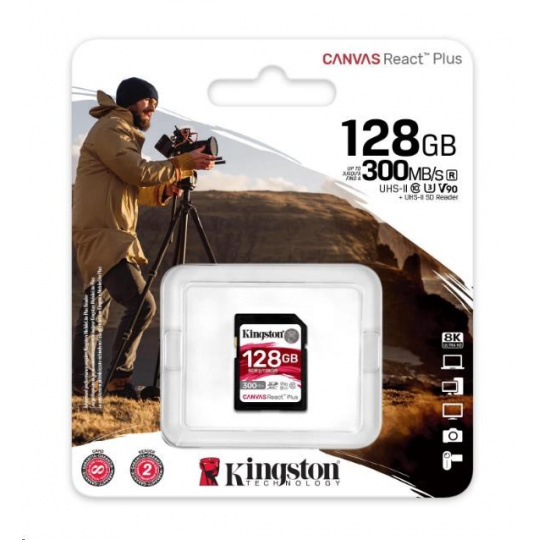 Kingston SDXC karta 128GB Canvas React Plus SDXC UHS-II 300R/260W U3 V90 for Full HD/4K/8K