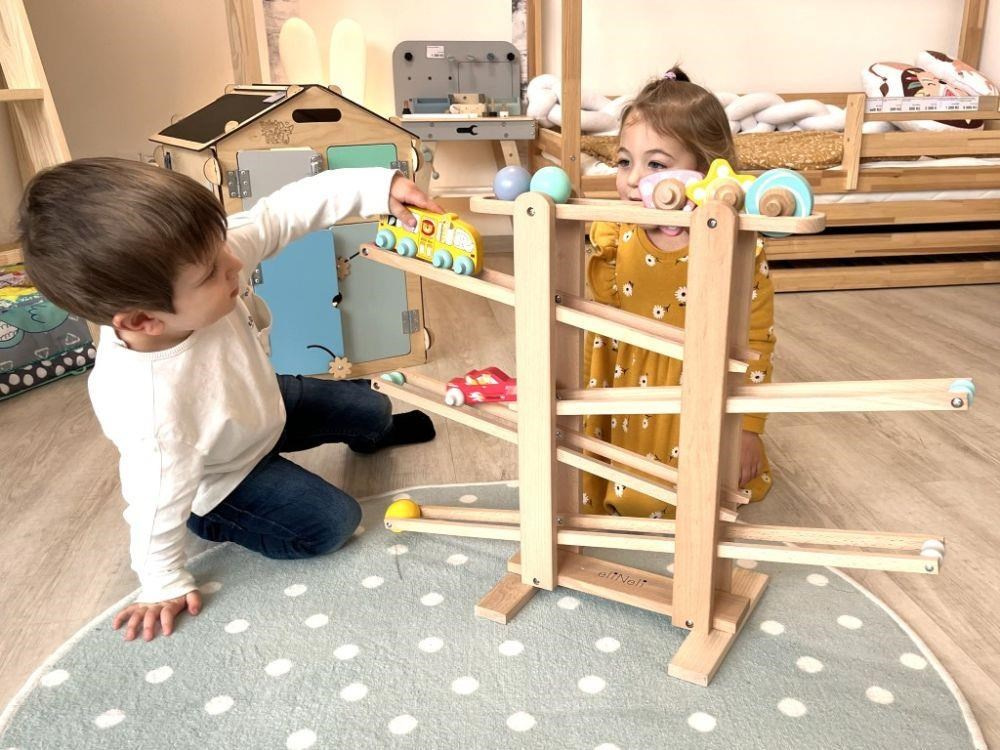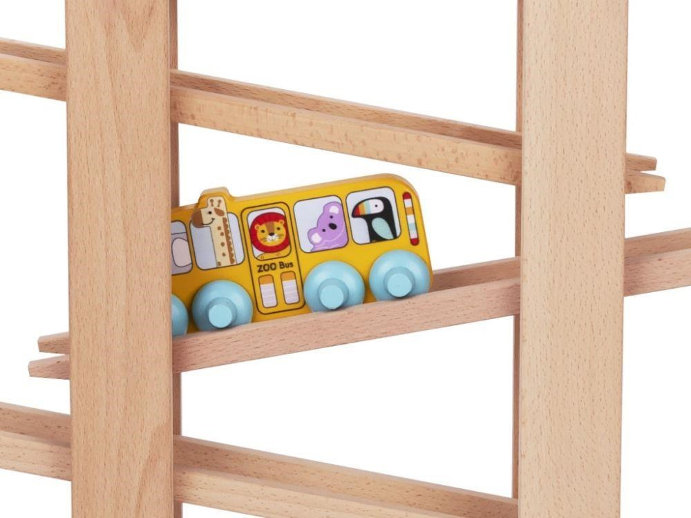Dřevěná kuličková dráha XL s originálními prvky v podobě parádního závodního autíčka a autobusu se zvířátky ze ZOO ZDARMA nadchne každé dítko. Kuličková dráha z tvrdého přírodního dřeva se 7 zábavnými prvky v krásných barvách zajistí zábavu nejen vaší holčičce nebo chlapci, ale i celé rodině. Stačí správně umístit kuličku, květinu, závodničku nebo bus na začátek dráhy a pak jen sledovat, jakou rychlostí zdolá všechna patra..