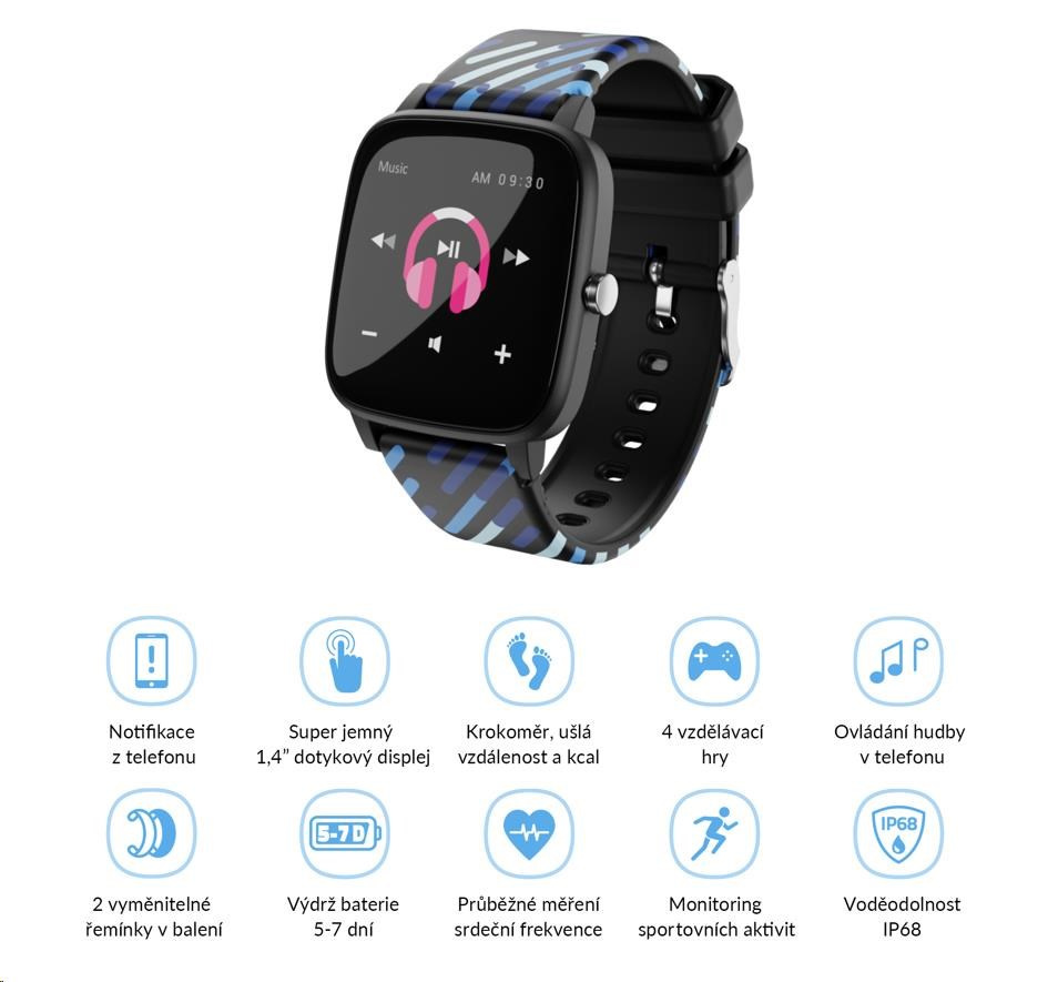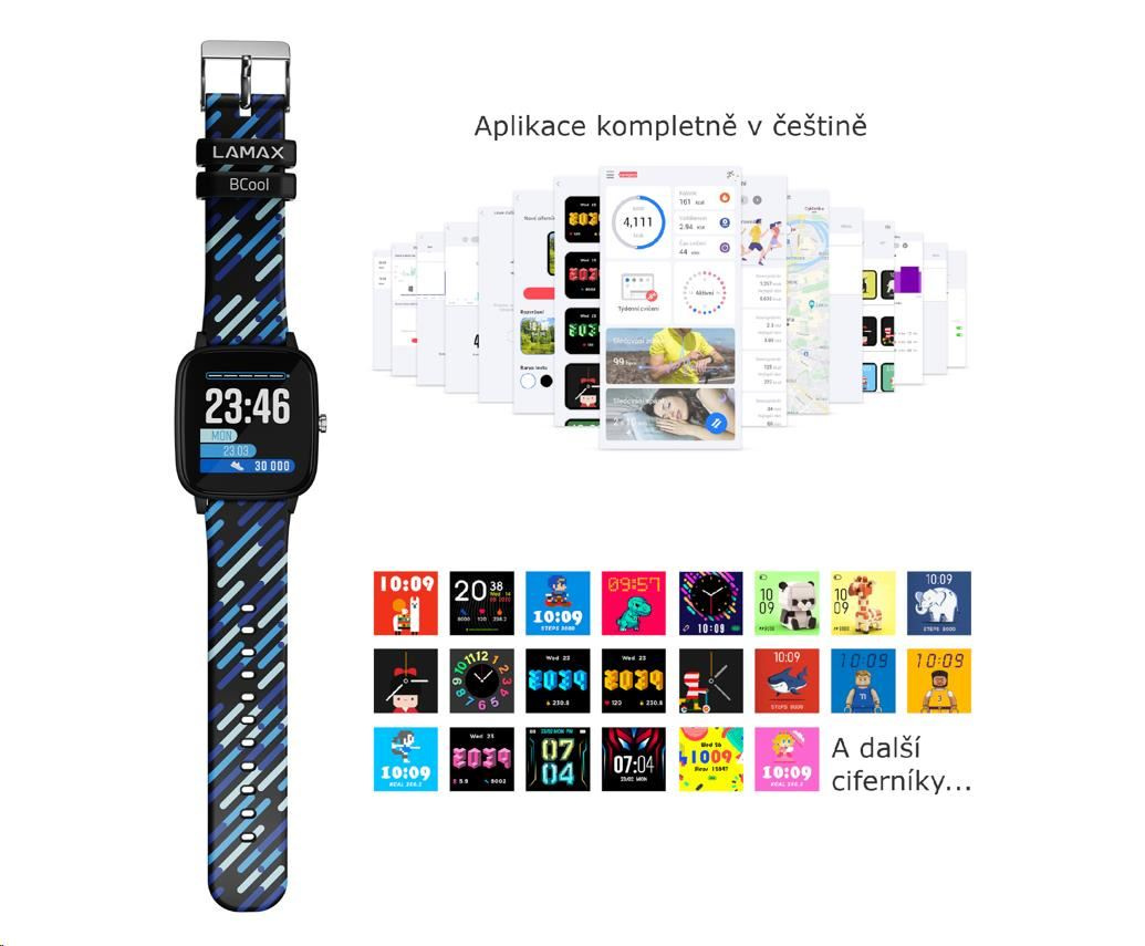 Chytré hodinky pro děti LAMAX BCool, výdrž až 7 dní, měření kroků, tepu a sportovních aktivit, analýza spánku, voděodolnost IP68, ovládání hudby, superjemný 1,4“ displej, podpora Android/iOS, 4 vzdělávací hry, dva řemínky v balení, slimfit design pro dětskou ruku, čeština.... více