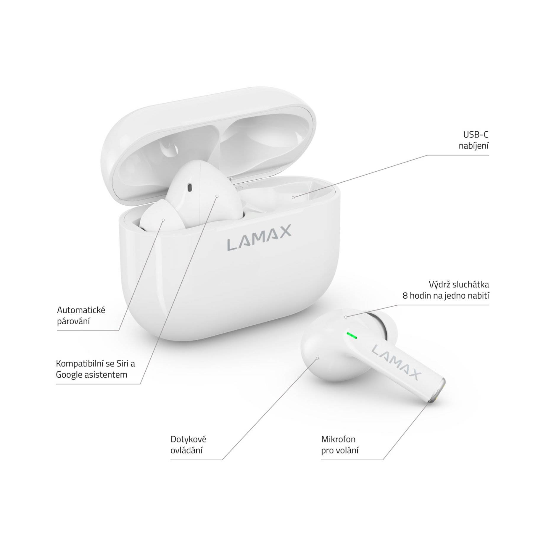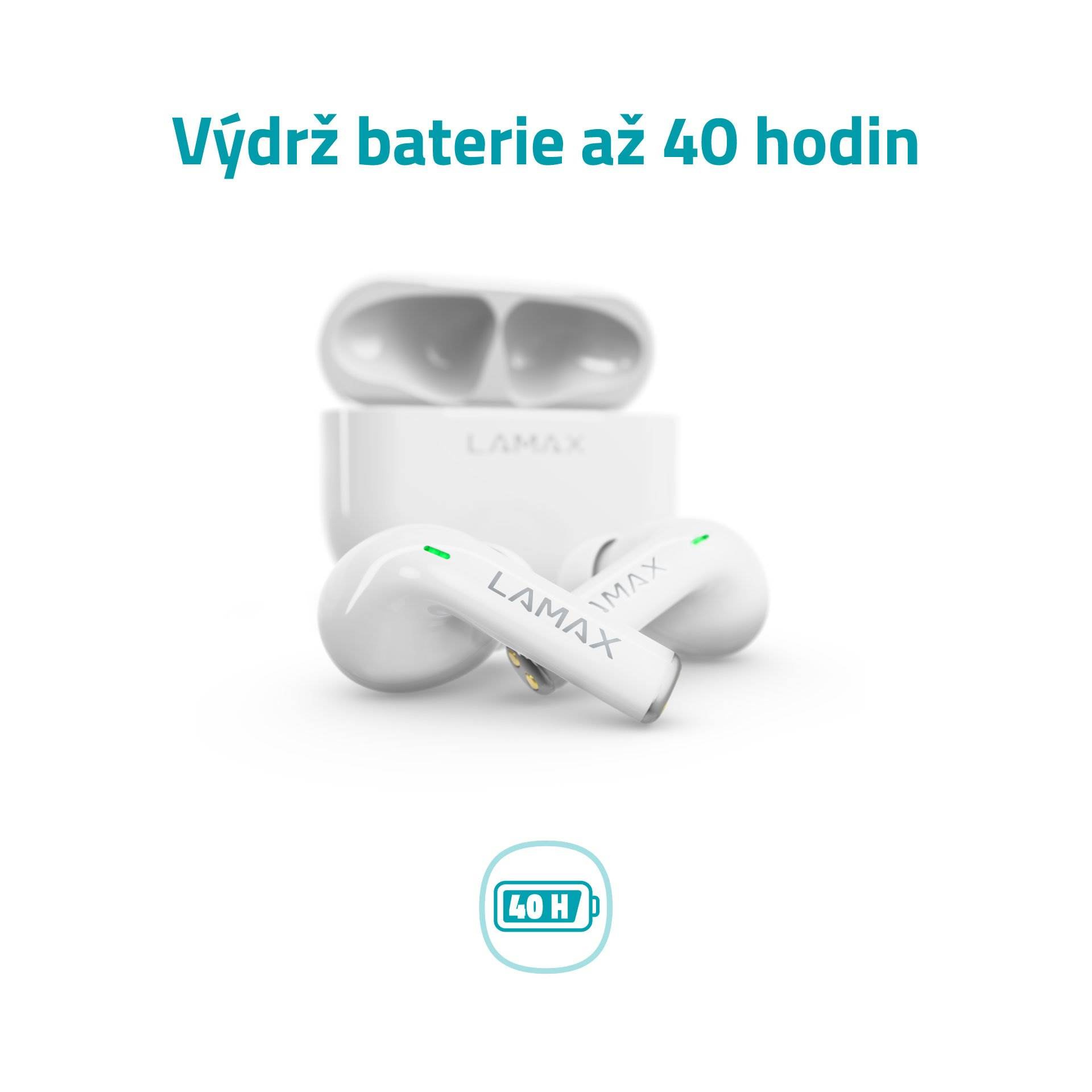 Bezdrátová TWS sluchátka, do uší, 8h výdrž/1 nabití, 40 hodin výdrž celkem, Bluetooth 5.1, dosah až 10 metrů, dotykové ovládání, USB-C, LAMAX BeatBass® technologie, automatické párování, herní režim, malé nabíjecí pouzdro, ukazatel nabíjení, kodeky AAC a SBC, podpora hlasových asistentů, náhradní náušníky..... více