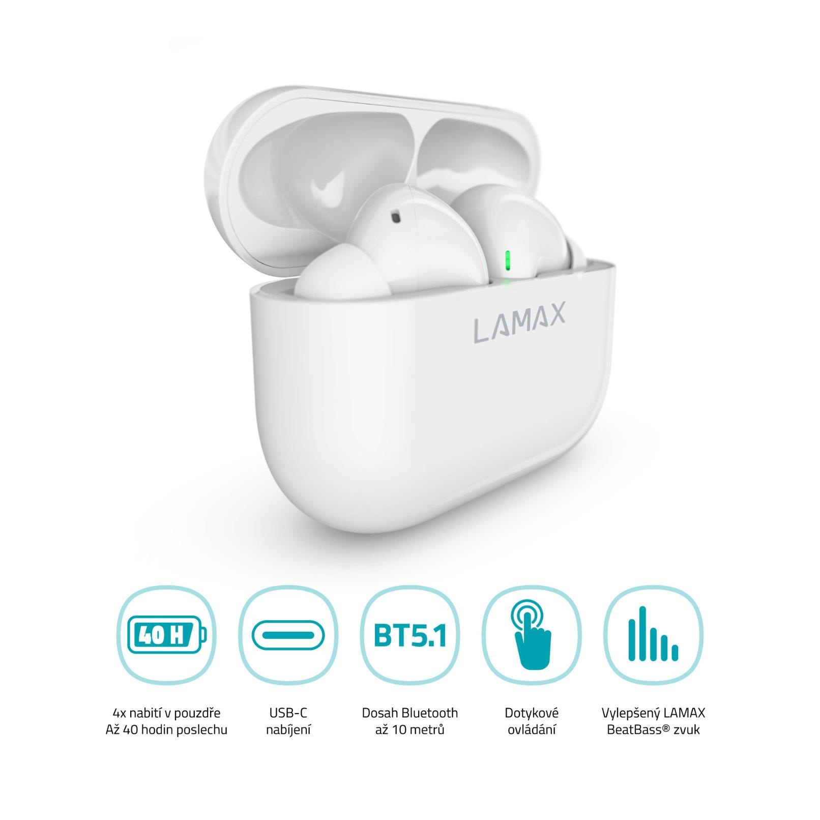 LAMAX Clips1 ti udělají radost vyladěným LAMAX BeatBass® zvukem, kdykoliv si je nasadíš. Nahoď fresh playlist a zaposlouchej se do masivních beatů! S nejnovějším Bluetooth 5.1 a AAC kodekem ti potečou songy z mobilu do sluchátek v nejvyšší kvalitě. Přepínej je rychlostí blesku díky dotykovému ovládání. Špunty se připojí, hned jak je vyndáš z pouzdra.