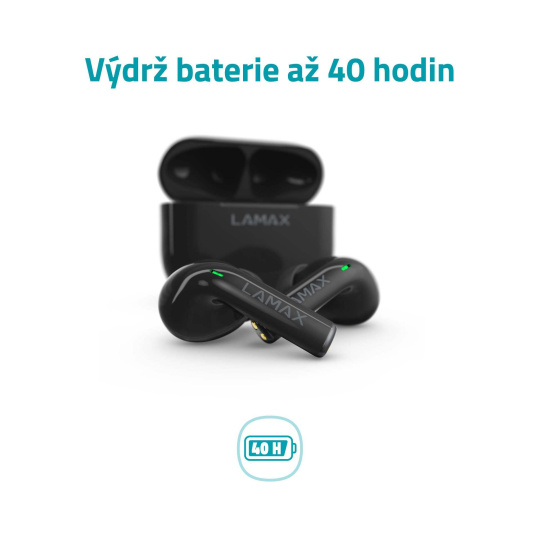 Bezdrátová TWS sluchátka, do uší, 8h výdrž/1 nabití, 40 hodin výdrž celkem, Bluetooth 5.1, dosah až 10 metrů, dotykové ovládání, USB-C, LAMAX BeatBass® technologie, automatické párování, herní režim, malé nabíjecí pouzdro, ukazatel nabíjení, kodeky AAC a SBC, podpora hlasových asistentů, náhradní náušníky..... více