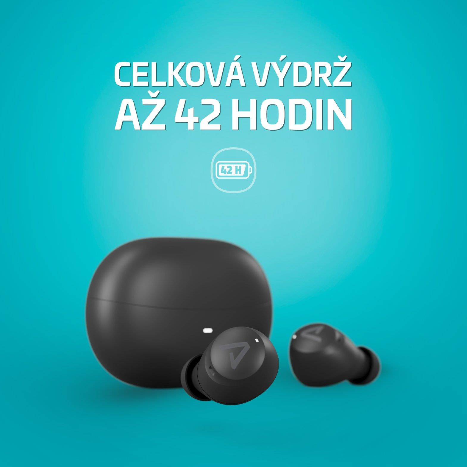 Samotný sluchátka vydrží až 10 hodin na jedno nabití a dalších 32 hodin ti přidá krabička. Dohromady získáš 42 hodin poslechu na jedno nabití. Na tak malý a skladný pouzdro naprostá pecka!
