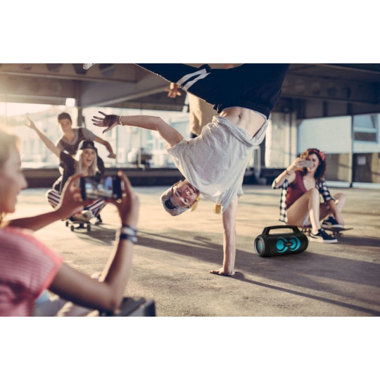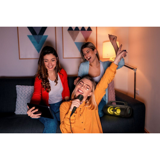 Ovládněte každou party. Součástí balení reproduktoru je mikrofon umožňující moderování nebo organizaci karaoke, kdy si můžete zazpívat se svými idoly. Hlasitost si snadno nastavíte.