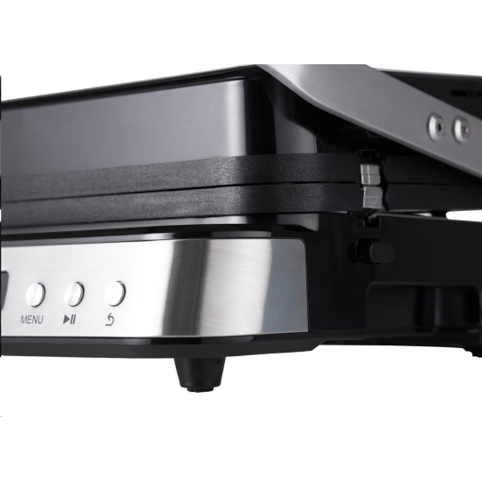 Kontaktní gril na zapékání, který po uvedení do vodorovné polohy přetvoříte na plnohodnotný stolní gril o ploše 1400 cm2.
