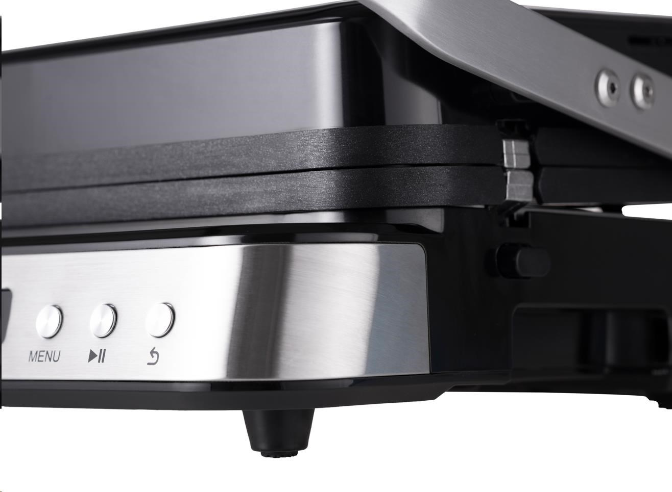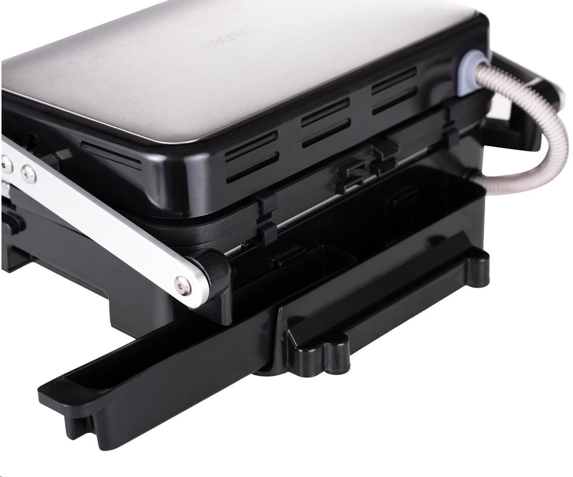 Kontaktní gril na zapékání, který po uvedení do vodorovné polohy přetvoříte na plnohodnotný stolní gril o ploše 1400 cm2.