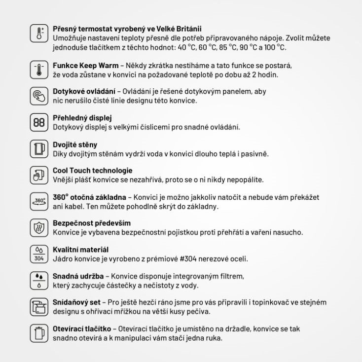Někdy zkrátka nestíháme a tato funkce se postará, že voda zůstane v konvici na požadované teplotě po dobu až 2 hodin.