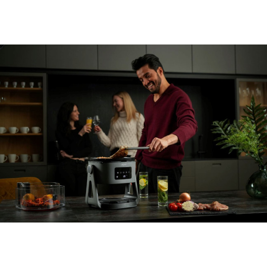 Horkovzdušná fritéza s grilem díky vysokorychlostní 360° cirkulaci vzduchu ušetří čas strávený v kuchyni, energii i zdraví. Nastartuje vaši cestu lepšího životního stylu, neboť oblíbená smažená jídla připraví s využitím až o 80 % menšího množství tuku. Rovnoměrného propečení dosahují pokrmy pronikáním infračerveného světla. Ještě více možností přípravy jídel poskytuje unikátní technologie umožňující otáčení horní části o 180°, a to především ve spojení s grilovací a hlubokou pánví, jež jsou součástí balení.