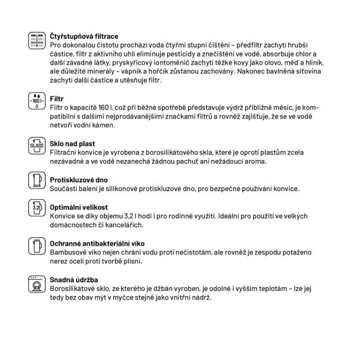 Filtrační konvice je vyrobena z borosilikátového skla, které je oproti plastům zcela nezávadné a ve vodě nezanechá žádnou pachuť ani nežádoucí aroma.
