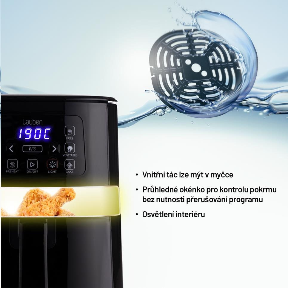 Ovládání Lauben Air Fryer je intuitivní a zvládne jej každý. Požadovaný program si nastavíte pomocí tlačítek a na displeji můžete kontrolovat teplotu a dobu přípravy. Díky průhledné části fritézy a osvětlení vnitřku můžete pokrm snadno zkontrolovat i vizuálně. Všechny komponenty, které se během přípravy jídla ušpiní, lze mýt v myčce nádobí. Třešničkou na dortu je vkusný minimalistický design, díky kterému můžete fritézu bez obav vystavit na kuchyňskou linku, i pokud si potrpíte na estetično.