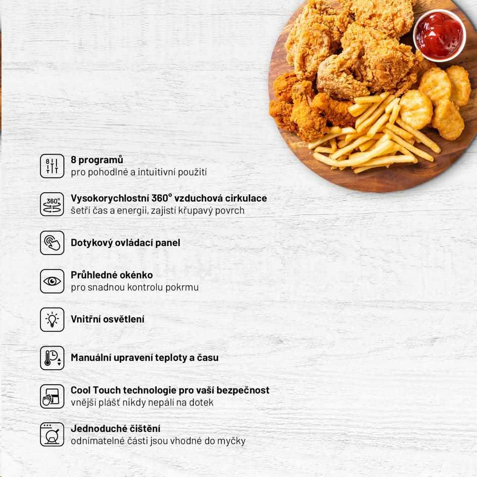 Až o 70% méně elektrické energie oproti troubě; až o 85% méně tuku a 50% rychleji hotové.