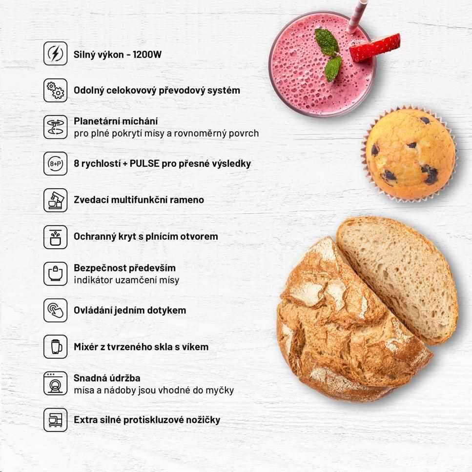 Kuchyňský robot, EffectiMix® planetární způsob míchání, příkon 1200 W, kovové vnitřní převody, kuchařka v balení, celoměděný motor, designové ocenění, objem nerezové mísy 5,5 l, 8 SpeedPrecision® rychlostí, PULSE, míchací a šlehací metla, hnětací hák, průhledný kryt mísy s otvorem, mixovací nádoba 1,5l z tvrzeného skla, sekáček, mlýnek na maso a tvořítko na klobásy.... více