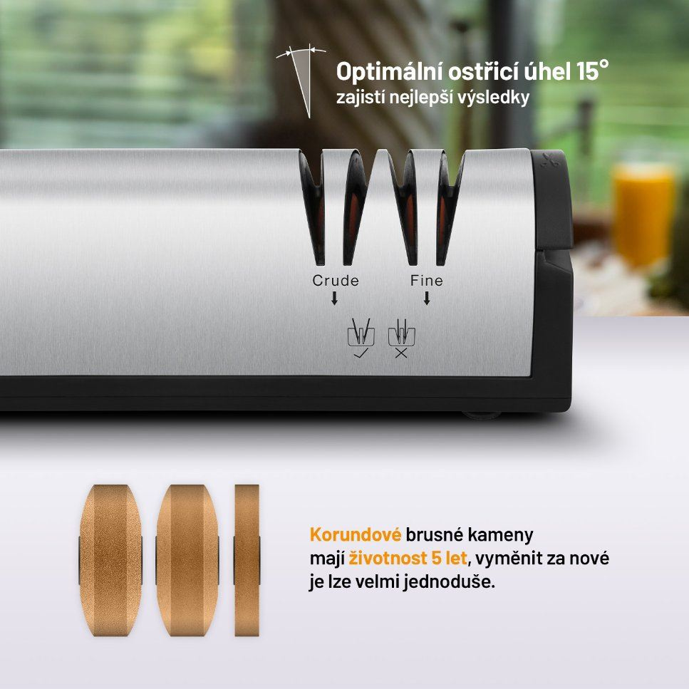 Pro to nejlepší nabroušení má bruska nastaven optimální brusný úhel 15°.
