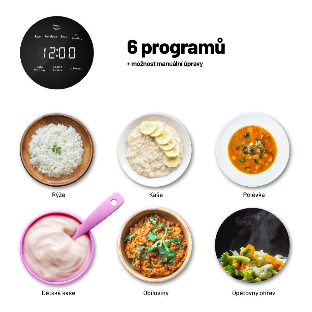 Každý, kdo si potrpí na prvotřídně připravené pokrmy a zároveň nechce trávit mnoho času v kuchyni, by se měl vybavit multifunkčním rýžovarem. Lauben Multifunction Rice Cooker 1200WR připraví po stisku jediného tlačítka všechny druhy rýže tím správným způsobem. Navíc disponuje 6 přednastavenými funkcemi – Rice, Porridge, Soup, Re-heat, Baby Porridge, Coarse Grains – pro snadnou přípravu polévek, kaší, obilovin či opětovný ohřev. Zdá se vám program krátký? Upravte si ho, některé umožňují manuální nastavení času.