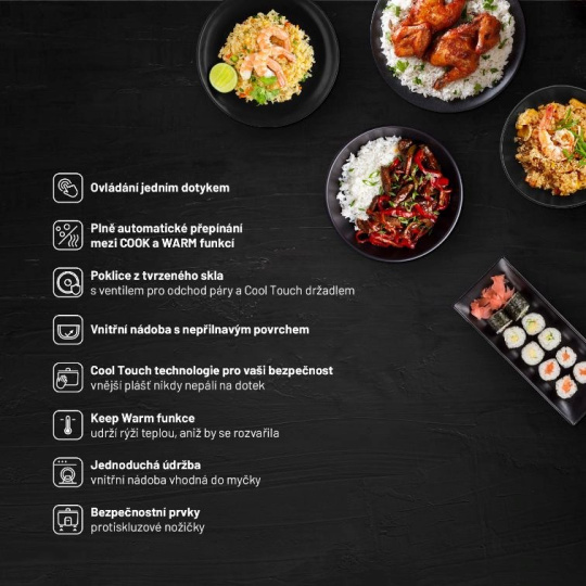 Rýžovar tvoří nádoba o objemu 1 litr s nepřilnavým povrchem. Příprava pokrmů tak nevyžaduje žádný přidaný tuk, a přesto se rýže ani ostatní suroviny nikdy nepřichytí. Velkou výhodou je funkce Keep warm, která udrží rýži teplou klidně celý den. Rýžovar se do tohoto módu přepne automaticky, jakmile skončí proces vaření.