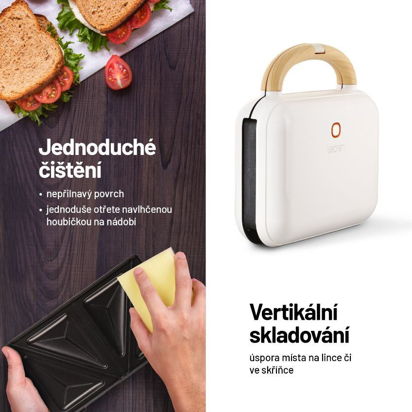 Nemáte zrovna čas na přípravu teplé večeře nebo vydatné snídaně? S toastovačem Lauben zvládnete obojí během pár minut. Klasickými toasty se šunkou a sýrem potěšíte každé dítě, rozhodně u nich ale nemusíte skončit. Sendvičovač Lauben si díky 3 sadám plotýnek poradí i se snídaňovou vaflí nebo grilováním masa. Nahřejete ho během chvilky a jídlo budete mít hotové dříve, než se vám podaří svolat všechny ke stolu. Potěší vás i snadná údržba a skladování. Sendvičovač vertikálně uložíte do kuchyňské skříňky a vyměnitelné plotýnky lze jednoduše otřít hladkou stranou houbičky na nádobí. Díky integrovaným protiskluzovým nožkám zůstane během přípravy jídla na místě. Mysleli jsme i na bezpečný provoz. Cool Touch držadlo zajistí, že se nikdy nespálíte a provoz indikuje LED kontrolka na povrchu přístroje. Přidanou hodnotou je prémiový design značky Lauben. Trendy off white provedení s dřevěným dekorem se totiž skvěle hodí do každé kuchyně.