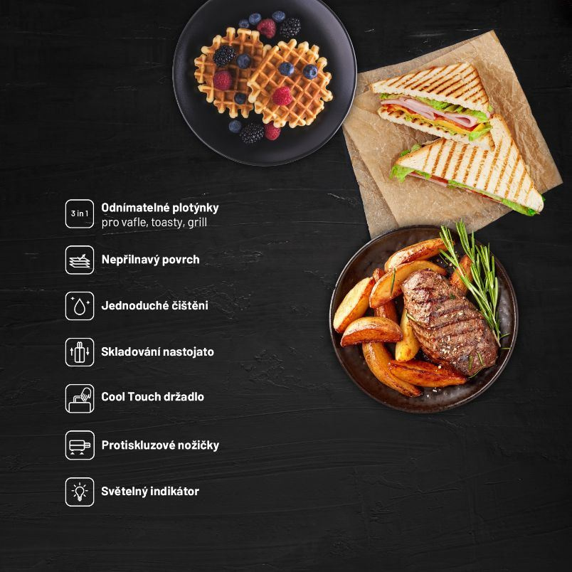 Toastovač, 900W, 3 sady vyměnitelných plotýnek s nepřilnavým povrchem, prémiový design s dřevěným dekorem, vertikální skladování, LED kontrolka, bezpečnostní západka.... více