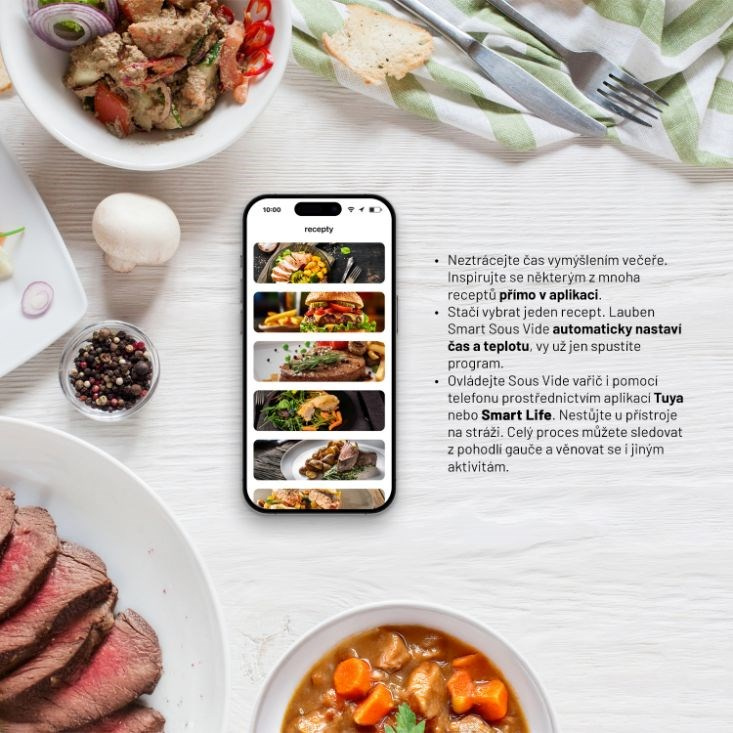 Ovládání Lauben Smart Sous Vide je hračka, a to i díky možnosti ovládání přes aplikace Tuya nebo Smart Life. Díky tomu máte vše pod kontrolou – aktuální teplotu, zbývající čas a můžete se dokonce inspirovat mnoha recepty přímo v aplikacích. Pro ty, kteří preferují klasiku, je k dispozici také dotykový displej. Nemusíte být žádný odborník, abyste s tímto vařičem vykouzlili kulinářská mistrovská díla. Stačí naskenovat QR kód na obalu a během chvilky se naučíte vše potřebné díky přehlednému video návodu. A co víc, Lauben Sous Vide se stane nejen praktickým pomocníkem, ale i stylovým doplňkem vaší kuchyně díky svému elegantnímu designu.