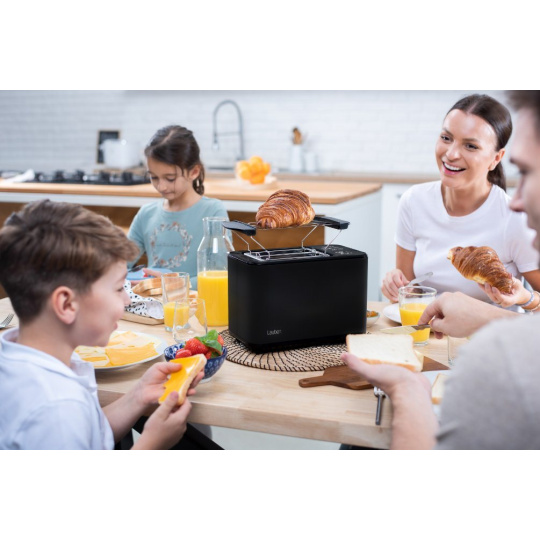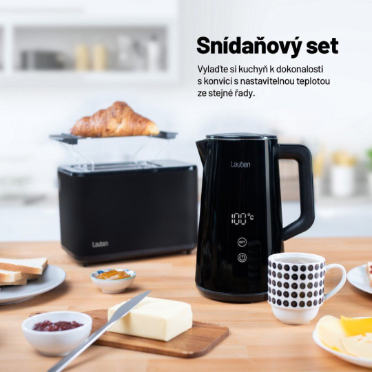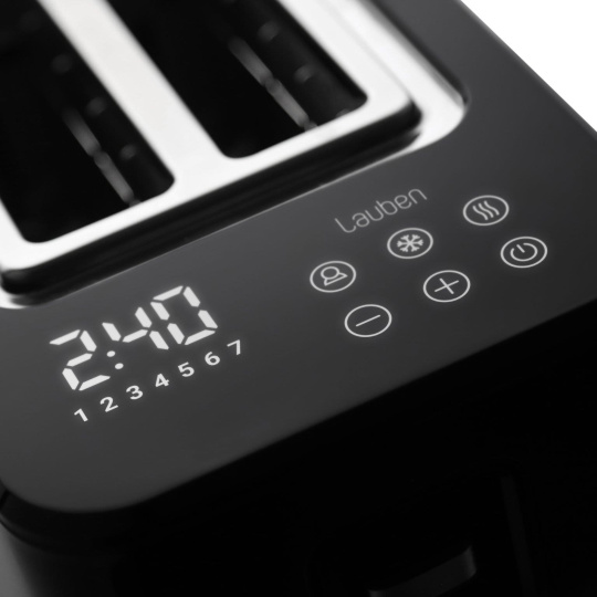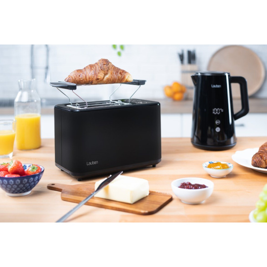 Křupavý toast k snídani namazaný máslem představuje pro mnohé dokonalý začátek dne. S Lauben Toaster 900BC získají vaše snídaně či svačiny zcela nový rozměr, díky digitálnímu nastavení na dotykovém displeji máte na výběr ze 7 stupňů intenzity opečení. Dokonce si svůj preferovaný stupeň opečení můžete uložit. Pokud nevíte jistě, jak moc opékat, kdykoliv lze proces manuálně ukončit. A stane-li se, že toast tak trochu vychladne, dejte si ho přihřát s funkcí Reheat. Velmi rychlé je rovněž rozpékání pečiva, kdy stačí dát svůj oblíbený croissant na ohřívací mřížku, zapnout a je jako z pekárny. Pomocí funkce Defrost zase vše snadno rozmrazíte. Údržba topinkovače není složitá, stačí vyjmout tác na drobky a vysypat. Vyladěnou kuchyňskou linku získáte s varnou konvicí ve stejném designu.