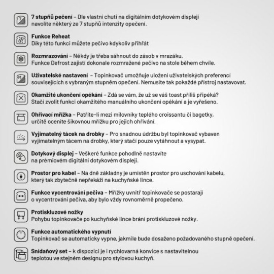 V topinkovači během chvíle připravíte dokonalý toast křupavý přesně tak, jak to máte rádi. Stačí nastavit jeden ze 7 stupňů intenzity. Svou preferenci si pak uložte na příště. Jestliže zkoušíte nový chléb a připéká se, kdykoliv ručně opékání přerušte. Nestíháte? Nevadí, s funkcí Reheat pečivo snadno přihřejete. Někdy je zase potřeba vytáhnout pečivo z mrazáku, pak přichází na řadu funkce Defrost. Opomenout nesmíme ohřívací mřížku, na níž připravíte třeba teplý croissant.