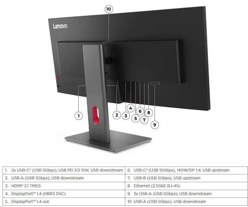 | Speciální funkce | HDR10 Compliance Lenovo Accessories and Display Manager Lenovo Accessories and Display Manager supports Windows 10 & 11, Mac OS, and Windows On Arm (functions vary across systems). Lenovo Accessories and Display Manager is formerly Lenovo Display Control Center. LDFM (Lenovo Display Fleet Manager) Natural Low Blue Light Smart Power |