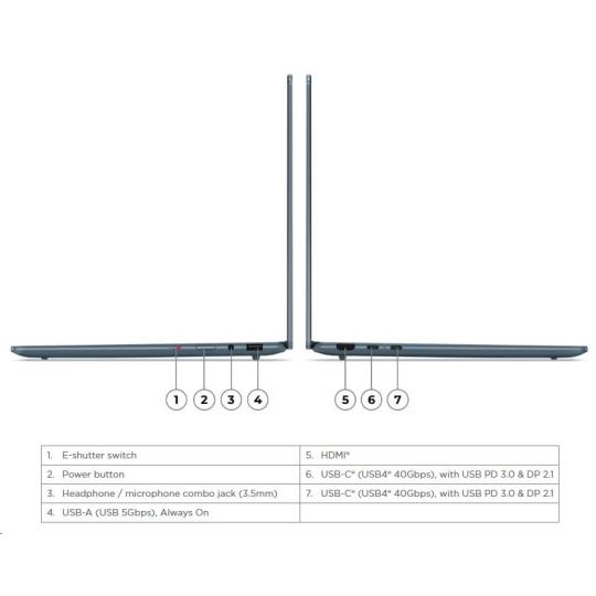 | Standartné porty | 1x USB-A (USB 5Gbps / USB 3.2 Gen 1), Always On 2x USB-C® (USB4® 40Gbps), with USB PD 3.0 and DisplayPort™ 2.1 1x HDMI® 2.1, up to 4K/60Hz 1x Headphone / microphone combo jack (3.5mm) |