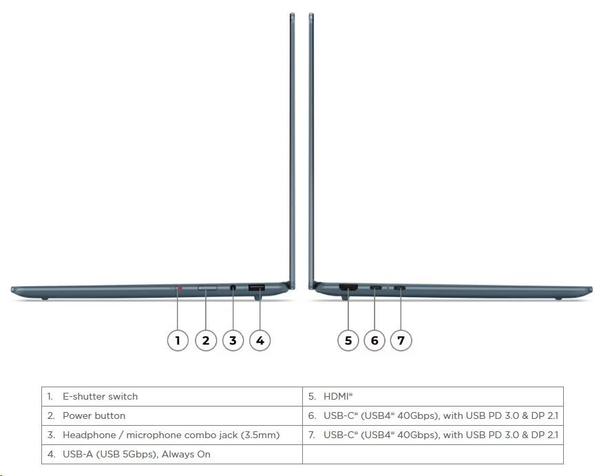 | Standartné porty | 1x USB-A (USB 5Gbps / USB 3.2 Gen 1), Always On 2x USB-C® (USB4® 40Gbps), with USB PD 3.0 and DisplayPort™ 2.1 1x HDMI® 2.1, up to 4K/60Hz 1x Headphone / microphone combo jack (3.5mm) |