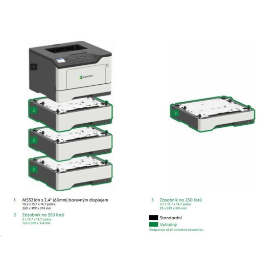 Obecné specifikace Část č. 36S0310 Technologie tisku Monochrome Laser Velikost pracovní skupiny Střední pracovní skupina Displej 2,4" (60mm) barevný LCD displej Podporované rozměry médií A6, Oficio, 7 3/4 Envelope, 9 Envelope, JIS-B5, A4, Legal, A5, Letter, Statement, Executive, Universal, DL Envelope, Folio, 10 Envelope Manipulace s papírem zahrnuta 100-Sheet Multipurpose Feeder, Integrated Duplex, Výstupní přihrádka na 150 listů, Integrovaný zásobník na 250 listů Standardní porty Gigabit Ethernet (10/100/1000), Port USB 2.0 Specification Hi-Speed Certified (typ B) Rozměry (V x D x Š) 260 x 399 x 374 mm Hmotnost 14.1 kg Rozměry balení (V x D x Š) 376 x 430 x 470 mm Hmotnost balení 15.99 kg Tisk Rychlost tisku 44 str./min.1 Rychlost tisku oboustranně) Až: černobíle: 22 str./min. (A4) Čas první stránky černobíle: 6.0 sekund Rozlišení tisku černobílého: 1200 x 1200 dpi, Kvalita 2400, 300 x 300 dpi, 600 x 600 dpi, Kvalita 1200 Duplexní oboustranný: Integrated Duplex Oblast tisku 4.0 mm od všech okrajů (včetně) Manipulace s papírem Podporované typy médií Papírové štítky, Tvrdý papír, Obyčejný papír, Transparencies, Envelopes, vinylové štítky, viz Card Stock & Label Guide Možnost dokončování No Počet vstupů papíru standardně: 2 maximálně: 5 Kapacita vstupu papíru standardně: 350 stránek maximálně: 2000 stránek 350 stránek Kapacita výstupu papíru Až: standardně: 150 stránek maximálně: 150 stránek Podporovaný rozsah gramáže papíru 60 - 120 g/m2 (standardní zásobník) 60 - 216 g/m2 (multifunkční zásobník) Doporučený měsíční objem tisku 2000 - 15000 stránek2 Maximální měsíční funkční cyklus 120000 stránek za měsíc3 Kazety a zobrazování Počty vytištěných stránek u kazet pro tiskárny až: 15,0004 -page High Yield Cartridge Kazeta na 6 0004 stran Extra vysokokapacitní kazeta na 20 0004 stran Ultra vysokokapacitní kazeta na 25 0004 stran Odhadovaný počet vytištěných stránek na zobrazovací válec Max.: 60000 stran při tisku 3 běžných stran/A4 na jednu tiskovou úlohu a při 5%pokrytí5 Tisková náplně dodávány s produktem První tonerová kazeta na 5 0000 stran, zařazená do vratného programu Náhradní kazety: Product functions only with replacement cartridges designed for use in a specific geographical region. See www.lexmark.com/regions for more details. Hardware Procesor 1.0 GHz MHz Paměť standardně: 512 MB maximálně: 512 MB Pevný disk Není k dispozici Jazyk tiskárny standardně: PCL 5e Emulation, PCL 6 Emulation, Microsoft XPS (XML Paper Specification), Personal Printer Data Stream (PPDS), PostScript 3 Emulation, PDF 1.7 emulation, Direct Image, AirPrint™ Fonty a znakové sady 2 PCL bitmap fonts, OCR-A, OCR-B scalable PCL 5e fonts, For more information, refer to the Technical Reference., 84 scalable PCL fonts, 91 škálovatelných PostScript fontů, 3 of 9 scalable PCL 5e fonts in Narrow, Regular and Wide, 5 PPDS bitmap fonts, 39 scalable PPDS fonts Dotykový displej No Možnosti připojení Přímé USB Ne Síť Ethernet Yes Bezdrátová Bezdrátové příslušenství Podpora síťových protokolů TCP/IP IPv6, TCP/IP IPv4, AppleTalk™, TCP, UDP Metody síťového tisku LPR/LPD, Pull Printing, Microsoft Web Services WSD, Secure IP (Port 96xx), FTP, TFTP, Enhanced IP (Port 9400), ThinPrint .print integration, IPP 1.0, 1.1, 2.0 (Internet Printing Protocol) Protokoly pro síťový management DHCP, APIPA (AutoIP), mDNS, IGMP, WINS, DDNS, SNMPv3, SNMPv1, SNMPv2c, Telnet, NTP, ICMP, HTTP, DNS, ARP, HTTPs (SSL6 /TLS), Finger Síťové zabezpečení SNMPv3, 802.1x Authentication: MD5, MSCHAPv2, LEAP, PEAP, TLS, TTLS Volitelné síťové porty Marknet N8370 WiFi Option Podporované operační systémy Podporované operační systémy Microsoft Windows Windows 10, Windows 8.1, Windows 8, Windows 8 x64, Windows 7 x64, Windows 8.1 x64, Windows 7 Podporované operační systémy Apple Apple OS X (10.6, 10.7, 10.8, 10.9, 10.10, 10.11, 10.12) Podporované operační systémy Linux Debian GNU/Linux 7.0, 8.0, Ubuntu 16.04 LTS, Fedora 23, 24, openSUSE Linux 42.3, Red Hat Enterprise Linux WS 6, 7, openSUSE Linux 13.2, SUSE Linux Enterprise Server 10, 11, 12 Citrix MetaFrame Microsoft Windows 2000 Server running Terminal Services with Citrix MetaFrame XP Presentation Server or Citrix MetaFrame Presentation Server 3.0., Microsoft Windows Server 2012 with Citrix XenApp 6.0, 6.5, Microsoft Windows 2000 Server running Terminal Services with Citrix Presentation Server 3.0, 4.0, Microsoft Windows 2000 Server running Terminal Services with Citrix Presentation Server 4.0 Podporované operační systémy Novell Novell Open Enterprise Server on SUSE Linux Enterprise Server, Novell NetWare 5.1(SP 6+), 6.0(SP 3+) with Novell Distributed Print Services (NDPS), Novell Open Enterprise Server 2 SP2 on SuSE Linux Enterprise Server 10 SP3 3, Novell NetWare 6.5 Open Enterprise Server, Novell Open Enterprise Server 11 on SUSE Linux Enterprise Server 11, Novell Open Enterprise Server 2 on SUSE Linux Enterprise Server 10 SP4 Podporované operační systémy UNIX Sun Solaris x86 10, 11, Sun Solaris SPARC 10, 11, IBM AIX 6.1, 7.1 Elektrické napájení a provoz ENERGY STAR Yes Obvyklá spotřeba energie podle standardu Energy Star 1.8 kilowatthodin za týden Hlučnost / Hlučnost v činnosti 14 dB (nečinná) 56 dB (Tisk) Hlučnost při oboustranném tisku pracovní režim: 55 dB Průměrná spotřeba v režimu hibernace / Průměrná spotřeba v režimu spánku / Průměrná spotřeba energie v režimu Připravena / Průměrná spotřeba energie při tisku 0.1 watts 2.0 watts 8 watts 620 watts Předepsané provozní podmínky Vlhkost: 8 až 80% relativní vlhkosti Teplota: 16 až 32°C Nadmořská výška: 0 - 5000 metrů Certifikace produktu ENERGY STAR, ICES-003 Class B, BSMI Class B, VCCI Class B, US FDA, UL 60950-1, FCC Class B, cUL CAN/CSA-C22.2 60950-1, NOM, CB EN/IEC 60950-1, 