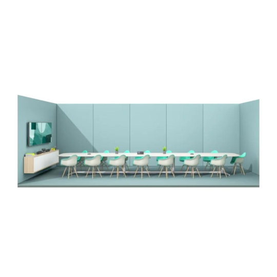 | Kabely/Napájení | Kamera > obrazový rozbočovač Počítač v konferenčním sále > obrazový/stolní rozbočovač Obrazový rozbočovač > stolní rozbočovač Obrazový rozbočovač > reproduktor (x2) Počítač v konferenčním sále > obrazovka (x2) Stolní mikrofon Zásuvka > zdroj napájení (x2) zdroj napájení > obrazový/stolní rozbočovač (x2) |