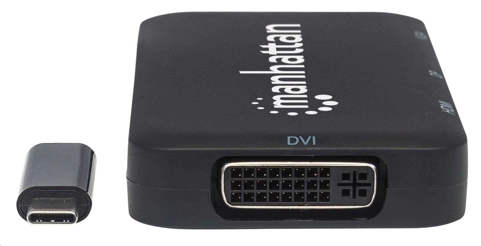The Manhattan USB-C 4-in-1 Audio/Video Converter establishes a fast, simple and convenient link between newer USB Type-C equipped media sources (computers, tablets, Smartphones, etc.) and existing HDMI, DisplayPort, VGA or DVI displays (monitors, projectors, etc.). The Manhattan USB-C 4-in-1 Audio/Video Converter is easy and quick to install — no complicated configuration or setup required. Its all-in-one design achieves a compact, integrated solution that eliminates unnecessary cables, tangles and clutter to keep installations and workspaces neat and orderly. Extend the service life of your equipment, and fully realize the investment and value of your HDMI, DP, VGA or DVI displays, projectors and peripherals with a Manhattan USB-C 4-in-1 Audio/Video Converter.