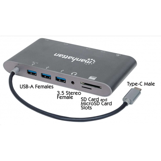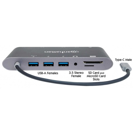 The Manhattan SuperSpeed USB-C to 7-in-1 Docking Station establishes a fast, simple and convenient link between newer USB Type-C-equipped media sources (computers, tablets, Smartphones, etc.) and an existing HDMI/Mini DP/VGA display (monitors, projectors, etc.), in either mirror- or extended-display mode. Create a mini-workstation by adding any USB 3.0 (and earlier) peripheral, such as a mouse, keyboard, hub, external memory device and more, with the integrated USB-A ports, Gigabit network connection, 3.5 mm Stereo and SD and Micro SD card slot, all while charging your device through the USB-C port.