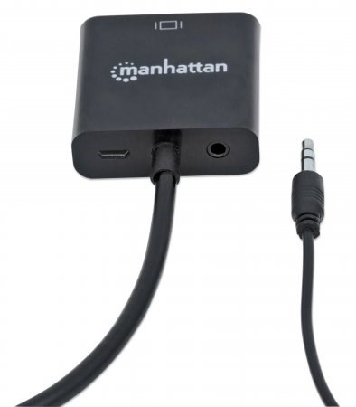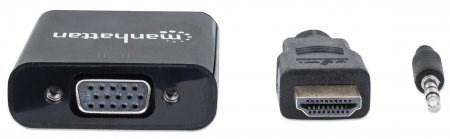 The Manhattan HDMI to VGA Converter helps establish a fast, simple and convenient link between newer HDMI-equipped desktop and notebook computers and other media sources with existing VGA monitors, projectors and other display devices. The Manhattan HDMI to VGA Converter is easy and quick to install and requires no complicated configuration or setup to help extend the service life and fully realize the investment and value of legacy VGA displays, projectors and other equipment. This low-power, cost-effective and reliable solution allows users to transition to HDMI bandwidths, resolutions, Deep Color and more without the expense of upgrading to newer and costly monitors and projectors. Its integrated, all-in-one design helps achieve a compact, integrated solution that eliminates unnecessary cables, tangles and clutter to keep installations and work spaces neat and orderly. Its 3.5mm stereo port allows the converter to transmit audio to an external audio device with convenient, included 3.5mm audio cable, and its Micro-USB port allows for additional power if required.