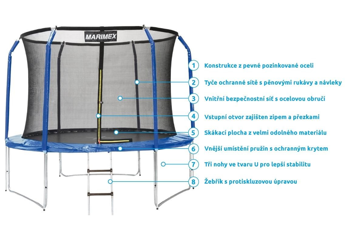 Vnitřní ochrannou síť najdete přímo v balení, nemusíte si ji dokupovat zvlášť. Vnitřní ochranná síť je bezpečnější než vnější síť - brání přístupu skákajícího do části s pružinami. Vstupní prostor je zajištěn třemi přezkami a brání vypadnutí. Tyče jsou obaleny ochranným návlekem z měkčené pěny. Nohy trampolíny jsou samostatné a zvyšují stabilitu celé trampolíny. Spojení tyčí nohou trampolíny a sítě je jištěno speciálními sponami.