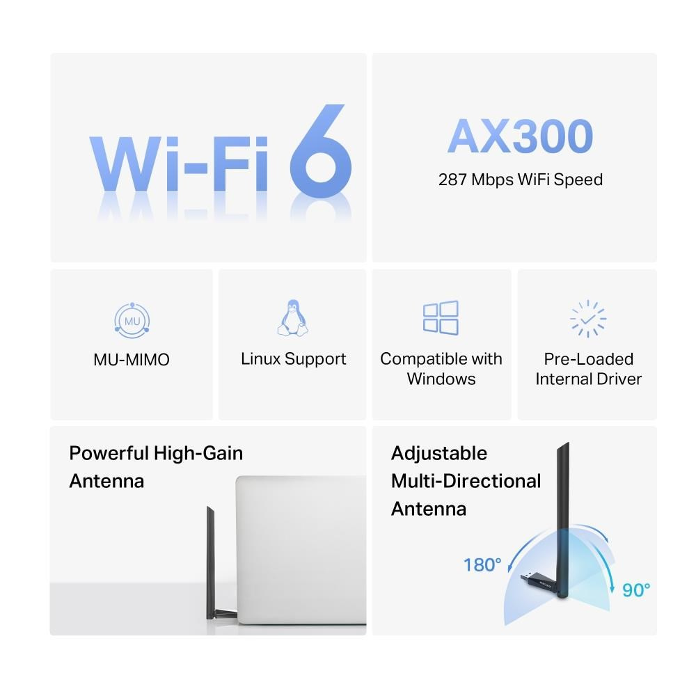 | Package Contents | AX300 High-Gain Wi-Fi 6 Wireless USB Adapter (MA14H) Quick Installation Guide |