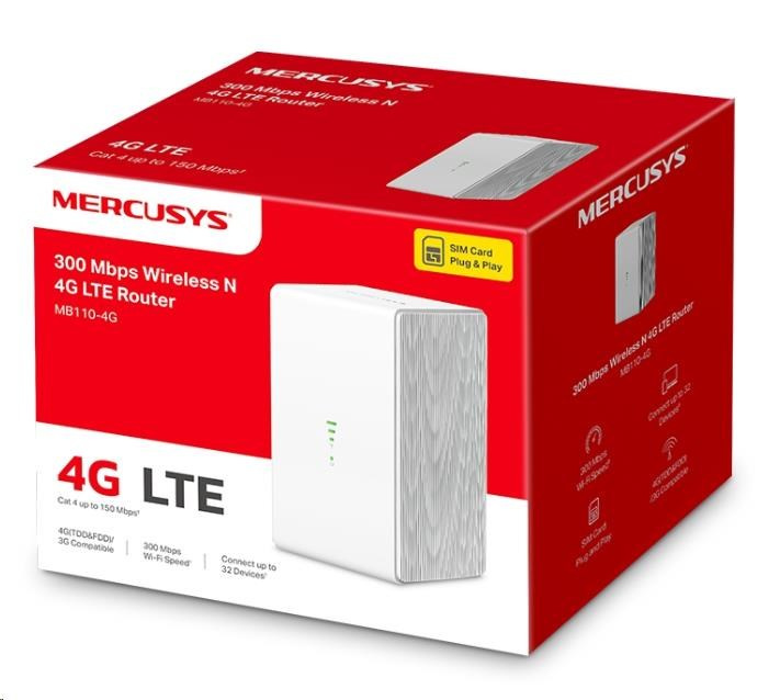 | Package Contents | 300 Mbps Wireless N 4G LTE Router (MB110-4G) Power Adapter RJ45 Ethernet Cable Quick Installation Guide |