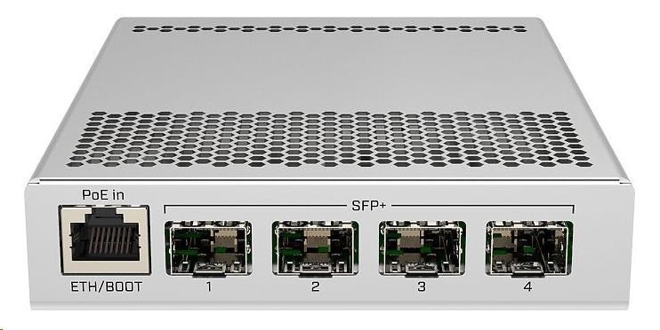 CRS305-1G-4S+IN je kompaktní, přesto velmi výkonný switch, který má čtyři SFP+ porty s rychlostí 10 Gbps/port. Zařízení má také kromě optických portů i jeden Gigabitový ethernet s podporou POE IN pro snadný přístup k zařízení, konfiguraci zařízení nebo jako převod na metalické vedení. K napájení slouží hned dva DC konektory pro redundanci napájení. Switch je velmi elegantní, kompaktní a jeho kovové pouzdro bez ventilátorů zajišťuje tichý provoz.