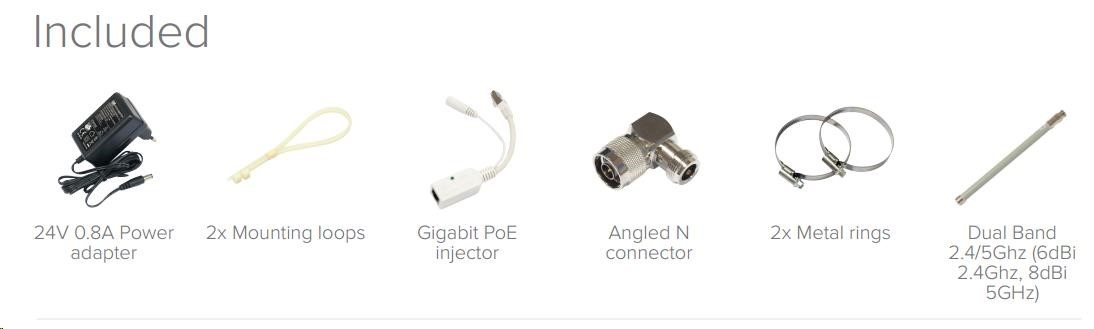 Balení obsahuje: RouterBOARD GrooveA-52HPn, PoE injektor, napájecí zdroj, montážní sada (o-kroužky), pravoúhlou N spojku a všesměrovou anténu 6dBi .