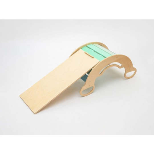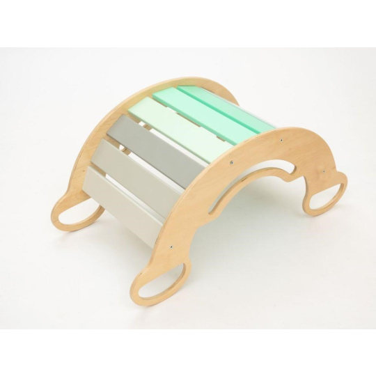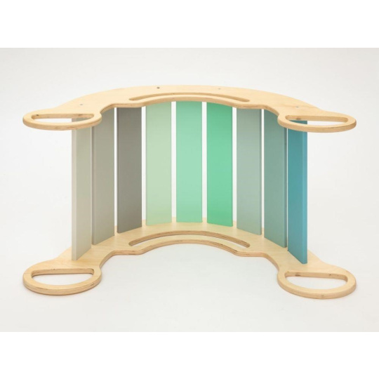 Dětská dřevěná Montessori houpačka smile 6in1, v příjemných pastelových barvách v modro-zelných tónech v kombinaci s neutrální šedou, vás překvapí svým designem i multifunkčností. Houpačka bude každý den svým širokým úsměvem lákat děti k příjemnému pohoupání i k zábavné hře. Její využití je všestranné, může být houpačkou, skluzavkou, prolézačkou, skrýší i sedačkou, při doplnění oboustranným prknem i dětským nábytkem. Oboustranné prkno není součástí houpačky. Vyrobená je z těch nejkvalitnějších materiálů, ručně dohladka opracovaná a lakovaná barvami s atestem. Montessori houpačka smile je širší než naše Montessori houpačky 5in1, proto k této houpačce nabízíme i speciální oboustranné prkno, které je doplňkem k houpačkám smile. Díky prknu snadno proměníte houpačku smile v dětský stoleček. Oboustranné prkno není součástí houpačky, pro využití houpačky jako nábytku je nutné prkno samostatně dokoupit..