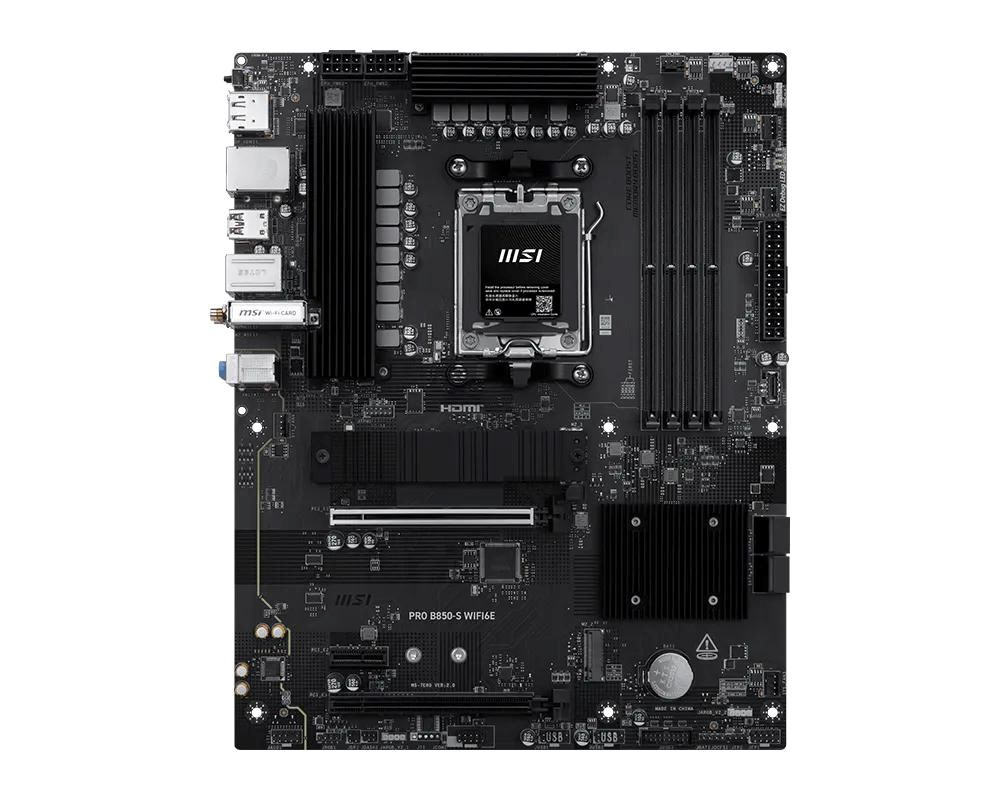 Základní deska PRO B850-S WIFI6E nabízí jednoduchý design s harmonickým barevným schématem, které se dokonale hodí k černým PC sestavám. Je vybavena mnoha exkluzivními funkcemi MSI, Wi-Fi 6E s anténou EZ Antenna, 2.5G LAN a PCIe 5.0 M.2 s chladičem M.2 Shield Frozr. Deska je plně připravena pro procesory řady AMD Ryzen 9000.