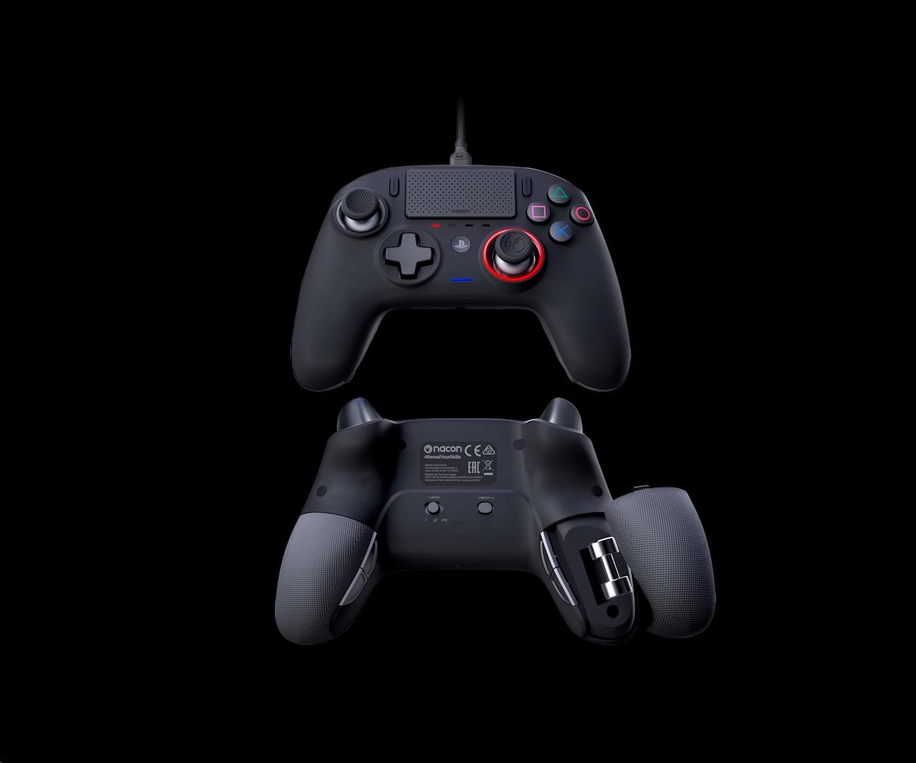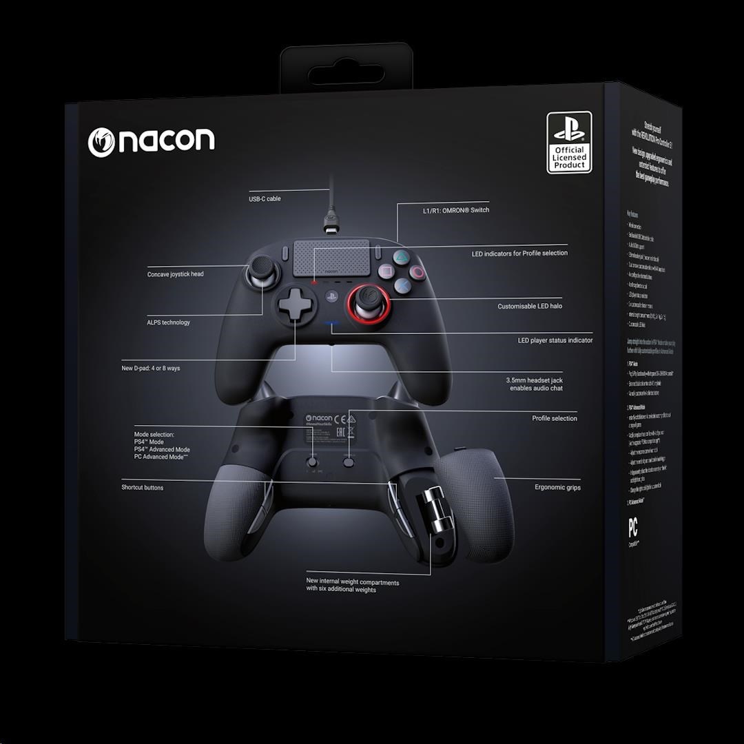 Drátový herní ovladač Nacon Revolution Pro Controller 3 disponuje nesouměrně umístěnými páčkami, rozměrnějšími spouštěmi, většími akčními i zadními tlačítky a také dvěma prostory pro závaží umožňujícími upravit hmotnost ovladače podle vašich konkrétních potřeb. Hrát můžete buď v běžném režimu pro PS4, nebo v pokročilých režimech pro PS4 a PC. S pomocí doprovodné aplikace můžete v těchto režimech upravit nastavení analogových páček i spouští, přiřadit libovolná tlačítka k tlačítkům zkratek, přepínat mezi čtyřsměrným nebo osmisměrným nastavením směrového ovladače, upravit sílu vibrací v úchopech, změnit barvu světelného kruhu kolem pravé páčky nebo nahrávat do ovladače vlastní herní profily, mezi kterými poté můžete bleskurychle přepínat.