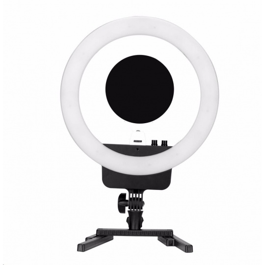 Stmívatelné dvoubarevné LED kruhové světlo Nanlite Halo 16 s napájením pomocí AC adaptéru nebo baterií Sony NP-F. Součástí balení je také držák na telefon, make-up zrcátko a přepravní pouzdro.